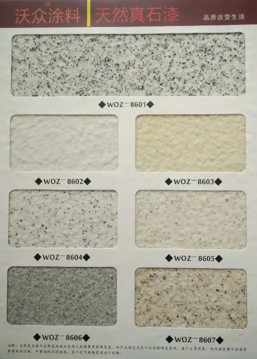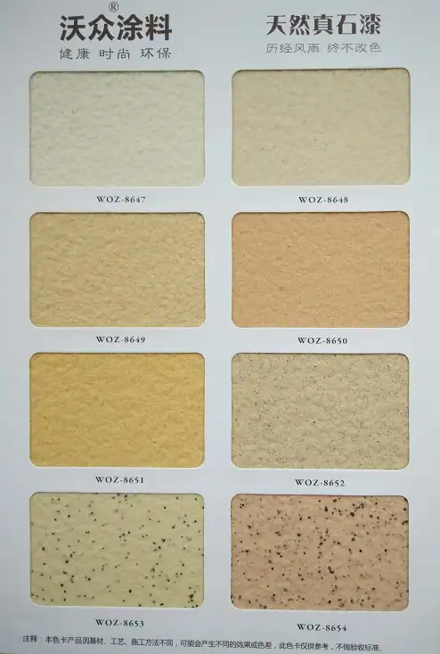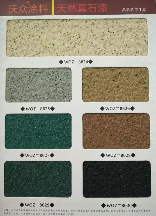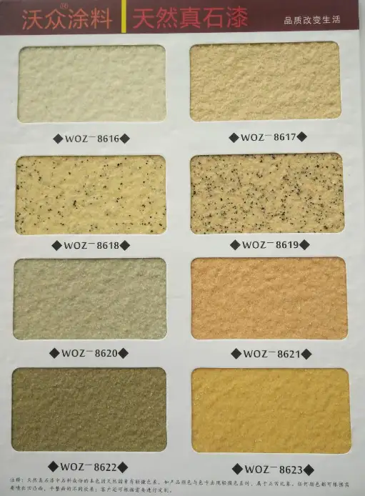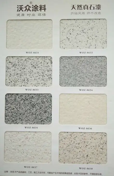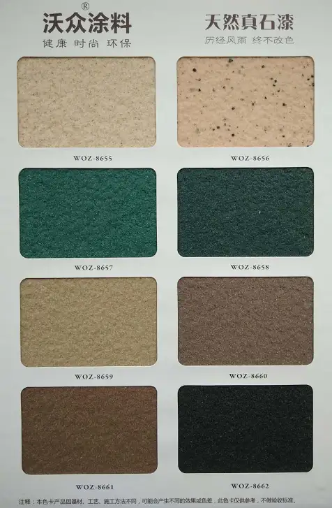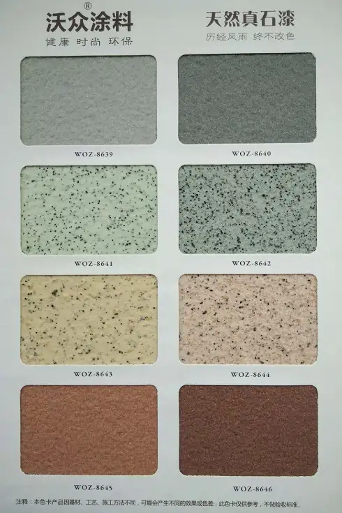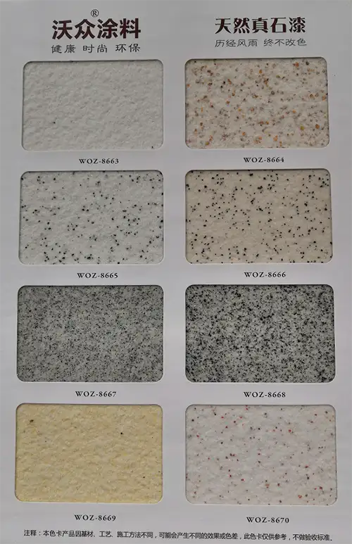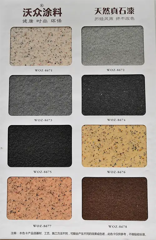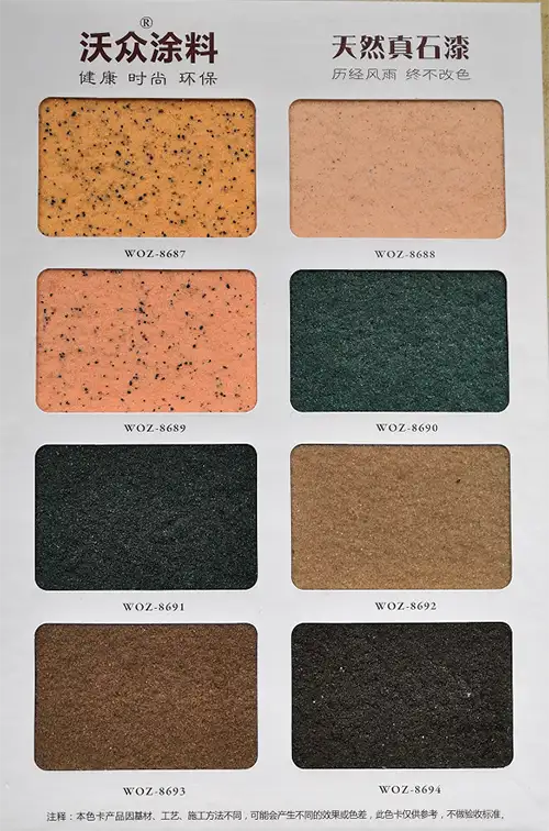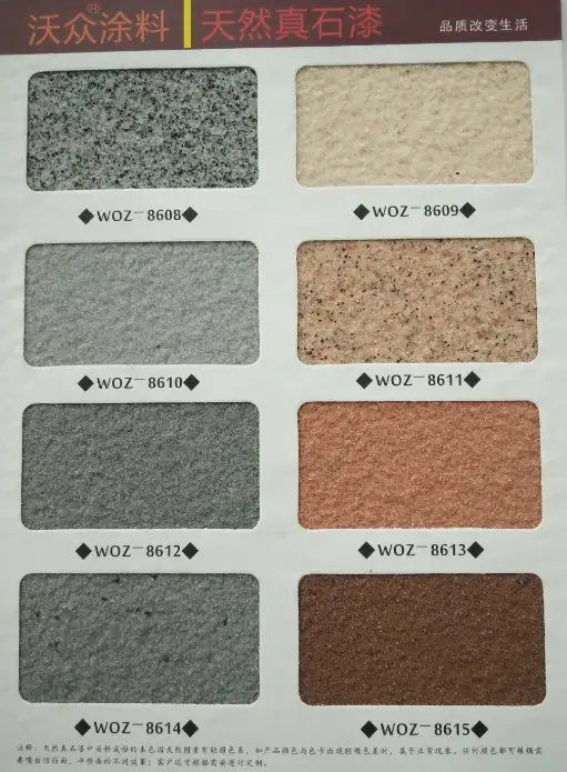 長沙沃眾涂料有限公司有近百種不同花色天然真石漆可供客戶選擇,仿石效果達到95%以上,還可根據用戶要求來樣定制。