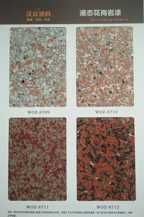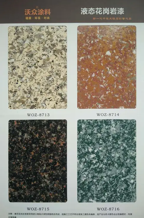 長沙沃眾涂料有限公司有近百種不同花色液態花崗巖漆可供客戶選擇,仿石效果達到90%以上,還可根據用戶要求來樣定制。